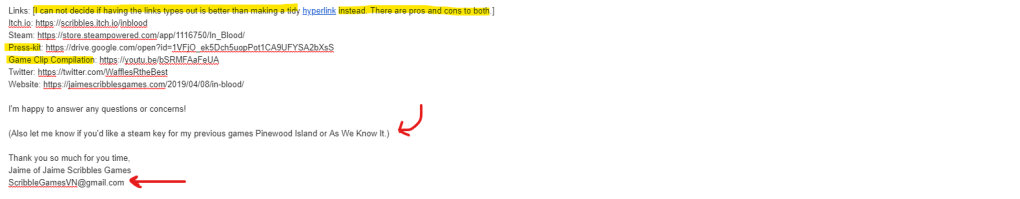 You’ll also notice I offered steam keys for my previous games. In emails I placed hyperlinks there to the steam pages, if they were interested. I only did this for youtubers who I thought might want to also play my previous games. I would not do this for press or blogs.